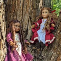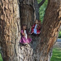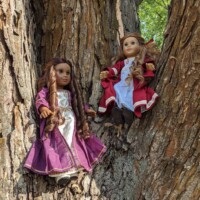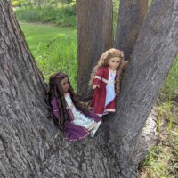 Two renaissance Princesses, Daria and Nora have escaped the castle to play in the meadows and climb some trees. With luck, they won’t make a mess of those beautiful gowns!